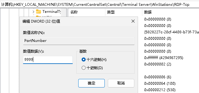 修改第二处,进入 计算机\HKEY_LOCAL_MACHINE\SYSTEM\CurrentControlSet\Control\Terminal Server\WinStations\RDP-Tcp,同上,设置为同样的端口:9999