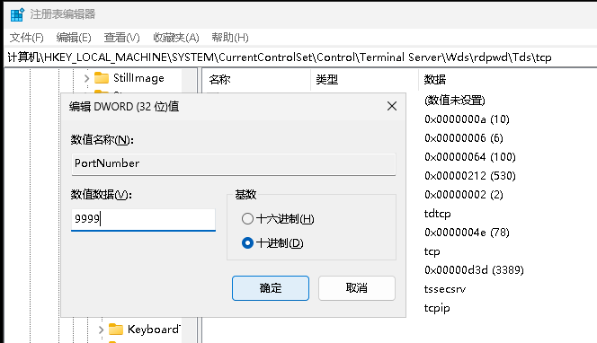 修改第一处,进入 计算机\HKEY_LOCAL_MACHINE\SYSTEM\CurrentControlSet\Control\Terminal Server\Wds\rdpwd\Tds\tcp,右击PortNumber,选择修改,默认端口为3389,新的端口按自己需求设置,这里设置为:9999