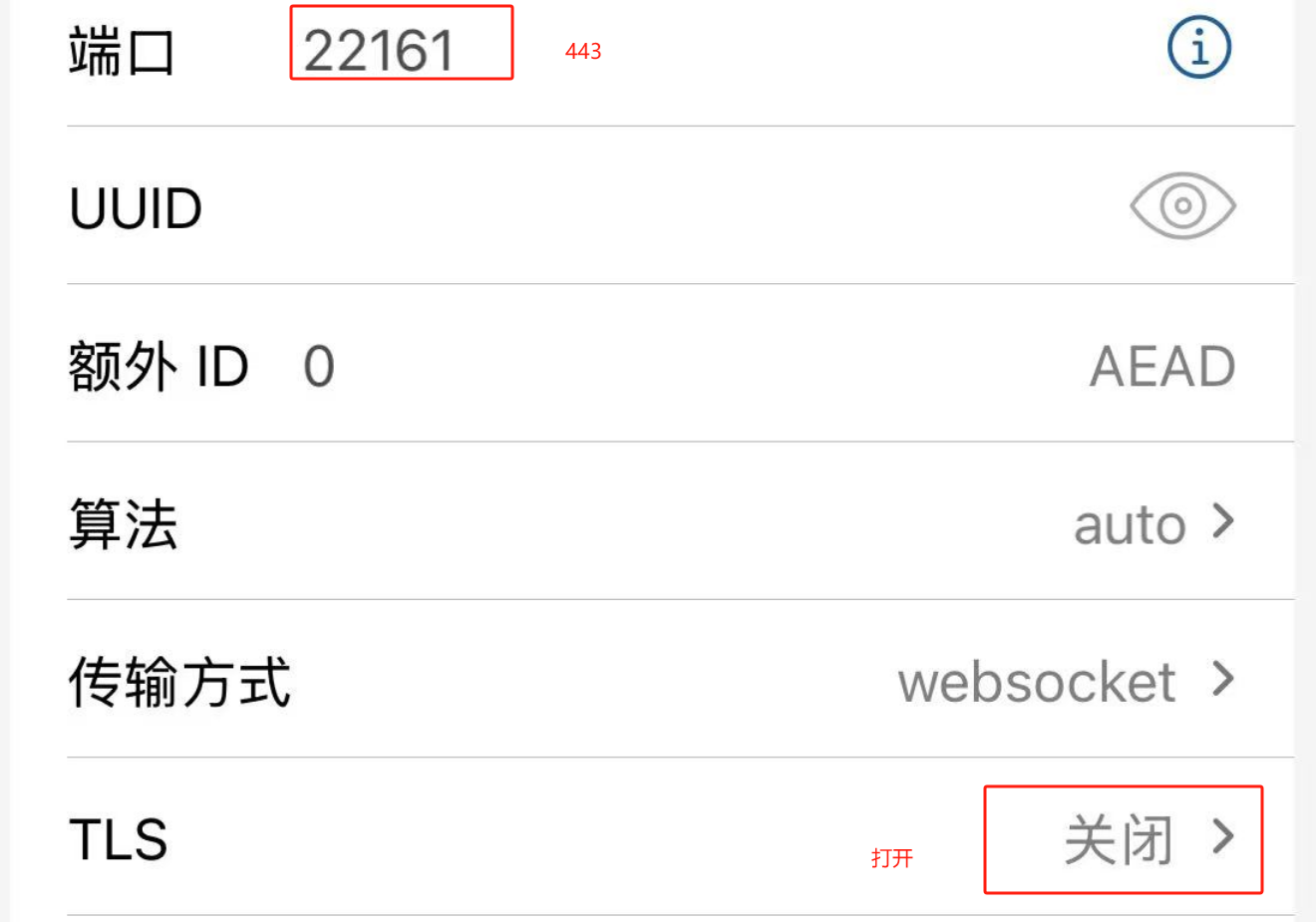 在小火箭中,端口号填写 443,加密方式建议选择 zero,效率更高(因为加密的工作已经在传输层由 TLS 帮我们完成了,就不需要二次加密了),传输层安全选择 TLS,其余默认。