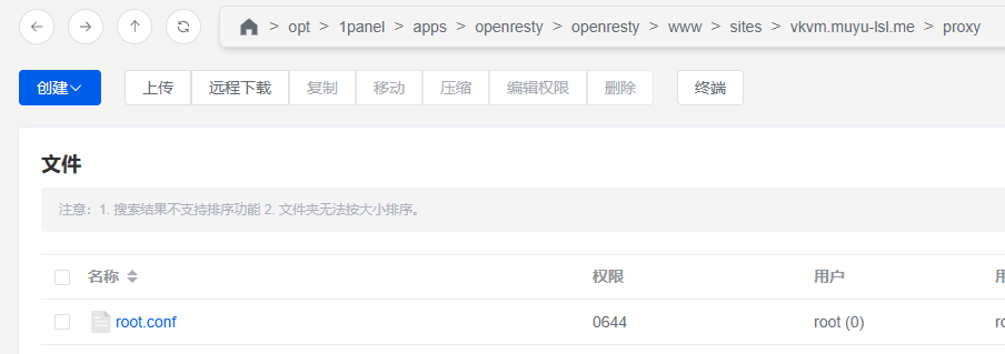 点击列表中的文件夹小图标打开网站目录,选择 proxy 文件夹,打开 root.conf 文件,填入以下内容: