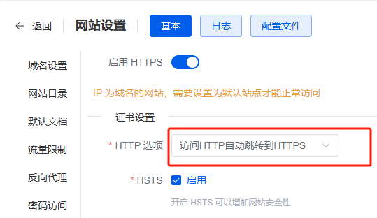 将 1Panel 中的 HTTP 选项从「HTTP 跳转到 HTTPS」改为「禁止 HTTP」