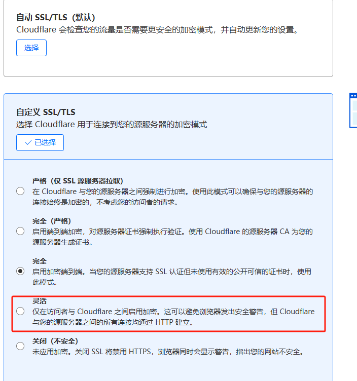 或者,将 Cloudflare 中的 SSL/TLS encryption mode 改为更高级的 完全 或者 完全(严格)