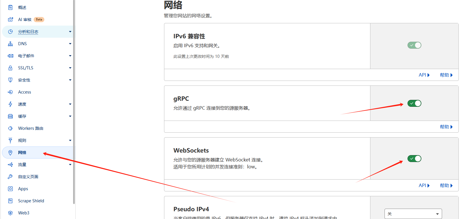 Cloudflare中添加A记录nz.a.com指向Dashboard 服务器 IP,开启小黄云。a.com域名设置页面——网络,选择开启WebSockets 和 gRPC ;SSL/TLS模式选择完全(严格)。