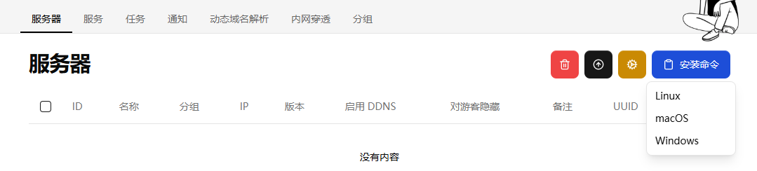 面板设置完成,可至服务器页面,点击安装命令,根据系统选择安装命令前往被控vps运行。