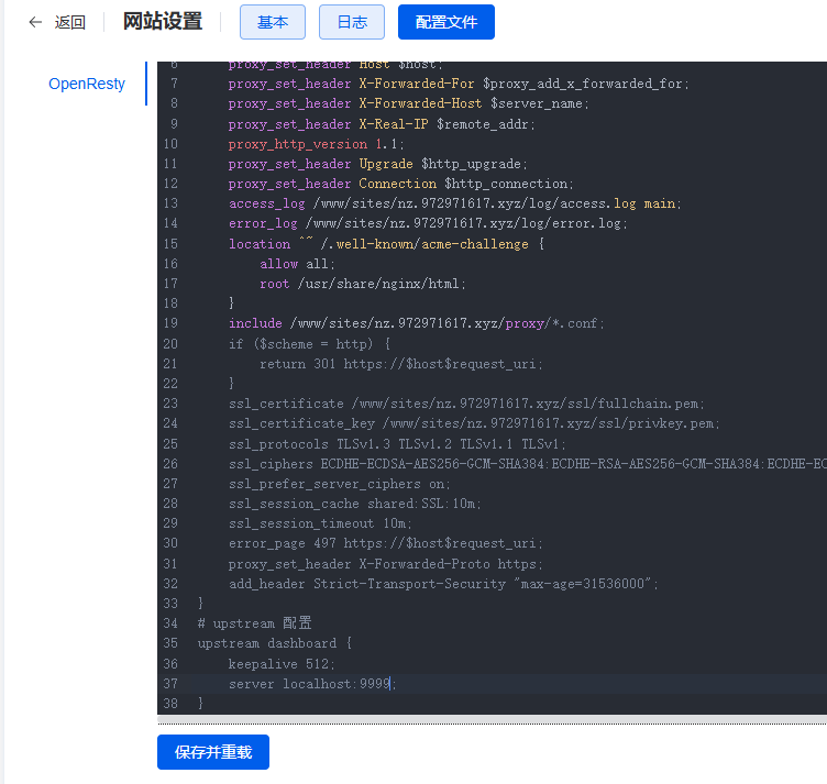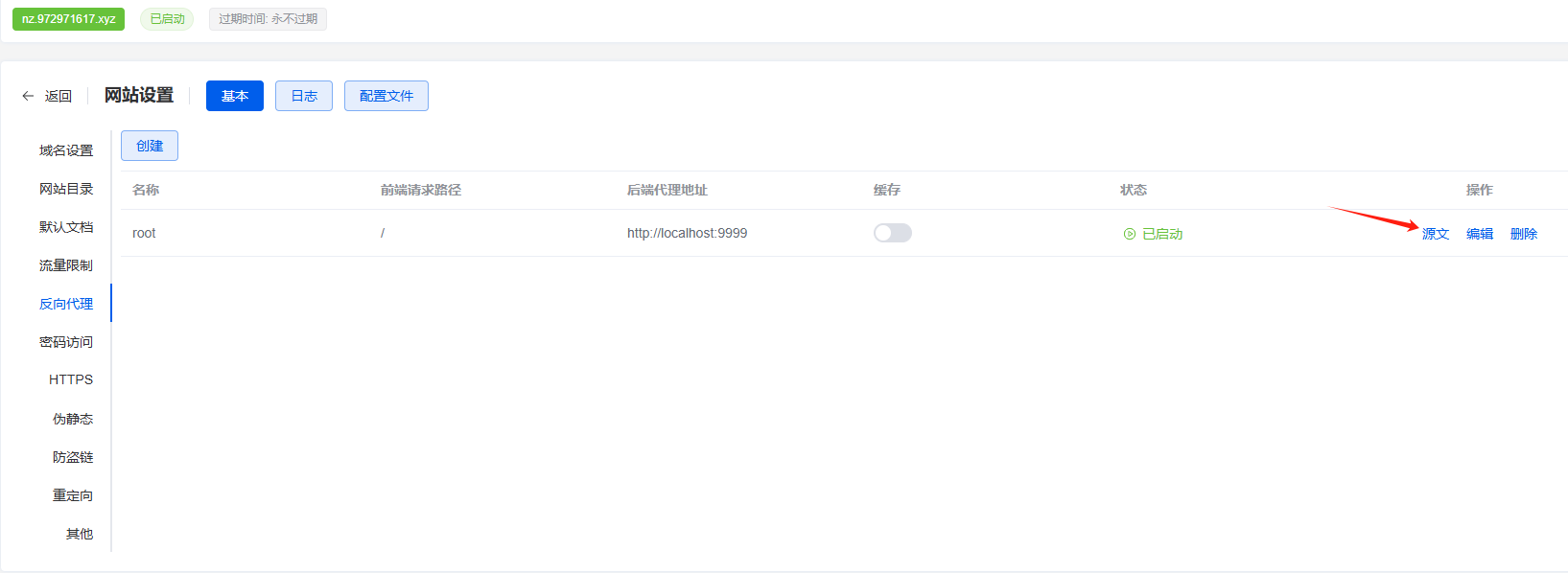 }打开网站 —— 反向代理 —— 源文,使用以下代码替换原内容,点击确认。至此,反向代理设置完成。