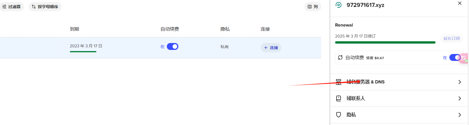 全是英文不好找到域名管理的地方,直接复制粘贴上面的域名续费地址最方便,进入域名管理页面,选择刚注册的域名,点击右侧红框位置进行域名续费。